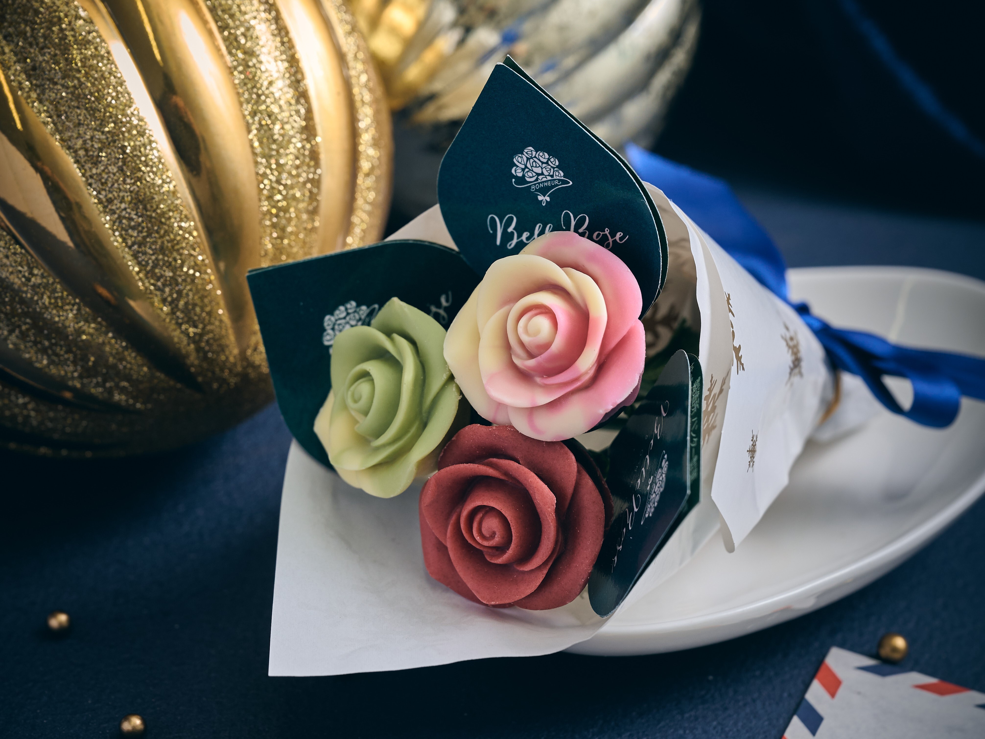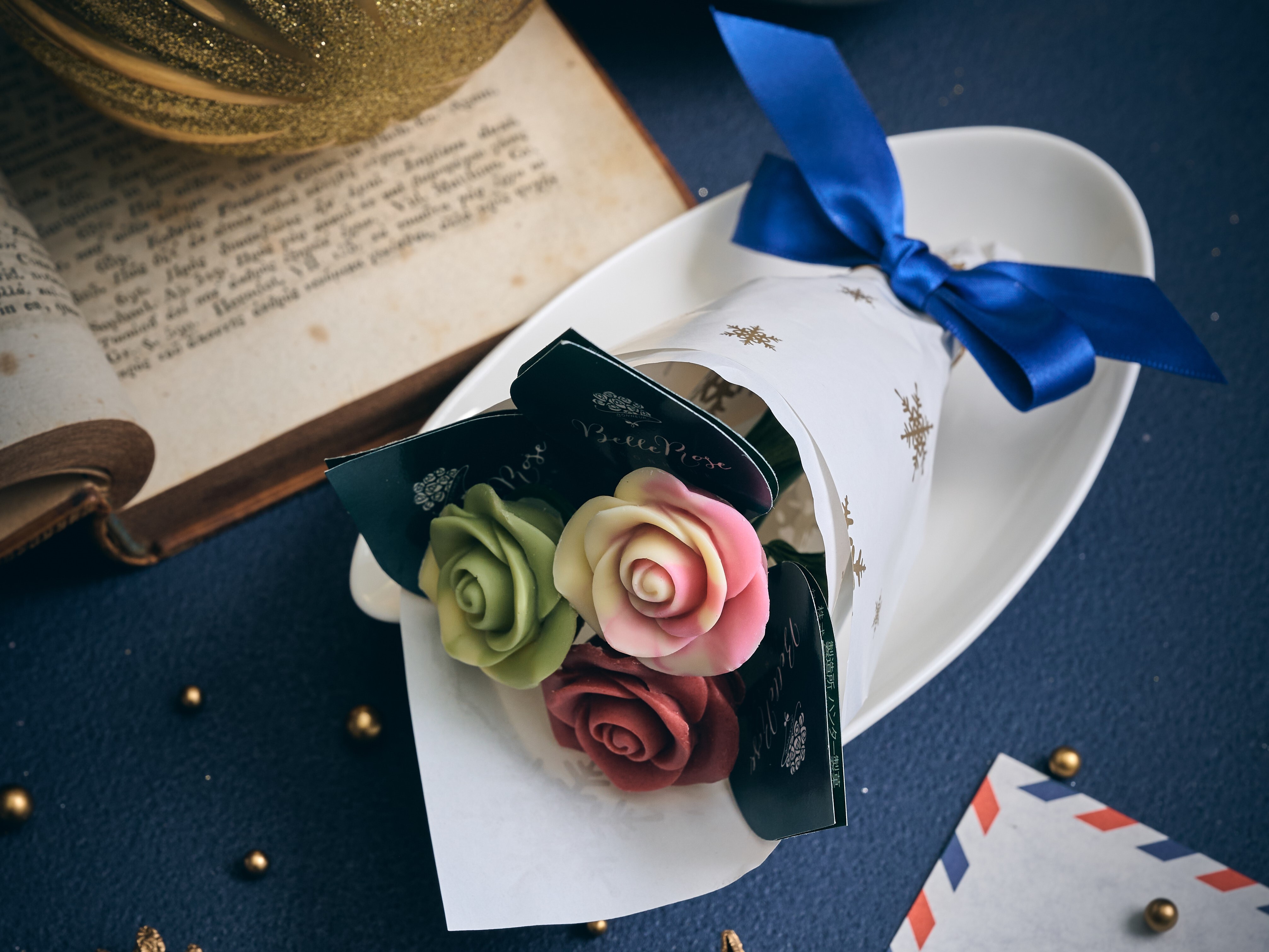 瑞々しい甘さのイチゴ、甘酸っぱくジューシーなピーチマーブル、リッチで上質な甘さのピスタチオマーブル。それぞれの個性豊かな味わいを楽しめる薔薇のショコラブーケです。清潔感のある白い包装紙に鮮やかなブルーのリボンをかけ、冬季限定でご用意しました。3本のブーケはBOX入りで、気軽に持ち運べるため、ホリデーシーズンの贈り物にぴったりです。