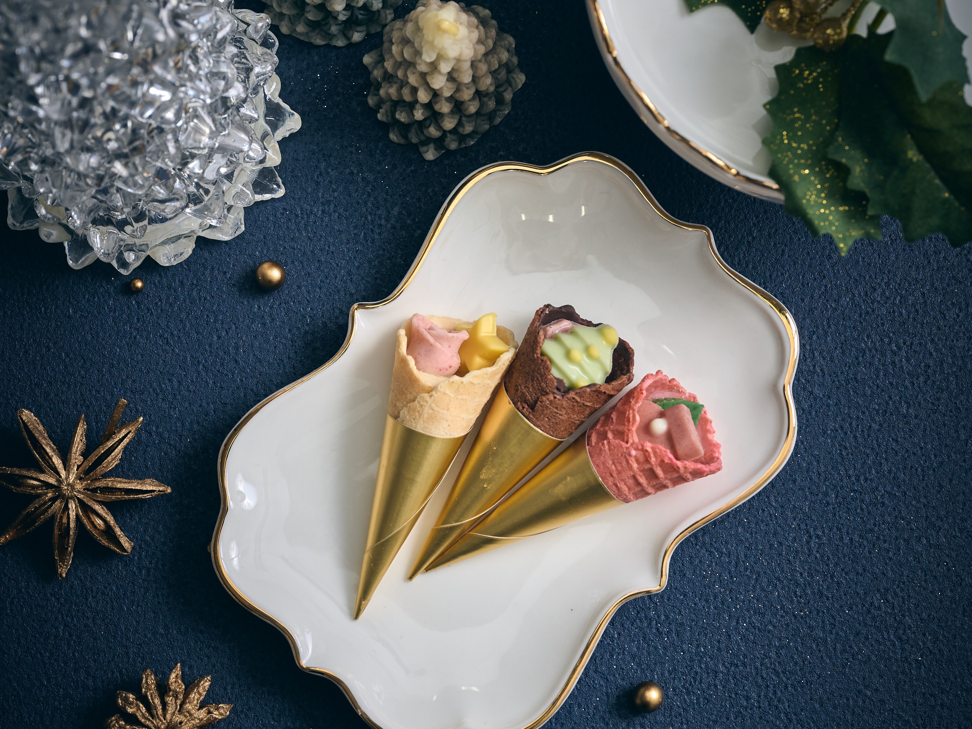 「TOKYOコーン・フルーリ」がクリスマス仕様で再登場。バニラコーン、イチゴコーン、チョココーンにクリスマスオーナメントの靴下、スター、ツリーをトッピングした一口サイズの可愛い花束ショコラです。クリアパッケージにシルバーのリボンをかけたデザインは、クリスマスのテーブルを彩る一品としてもお楽しみいただけます。また、プチギフトとして気軽に贈ることができ、大切な方やお世話になった方へのささやかな贈り物としても最適です。