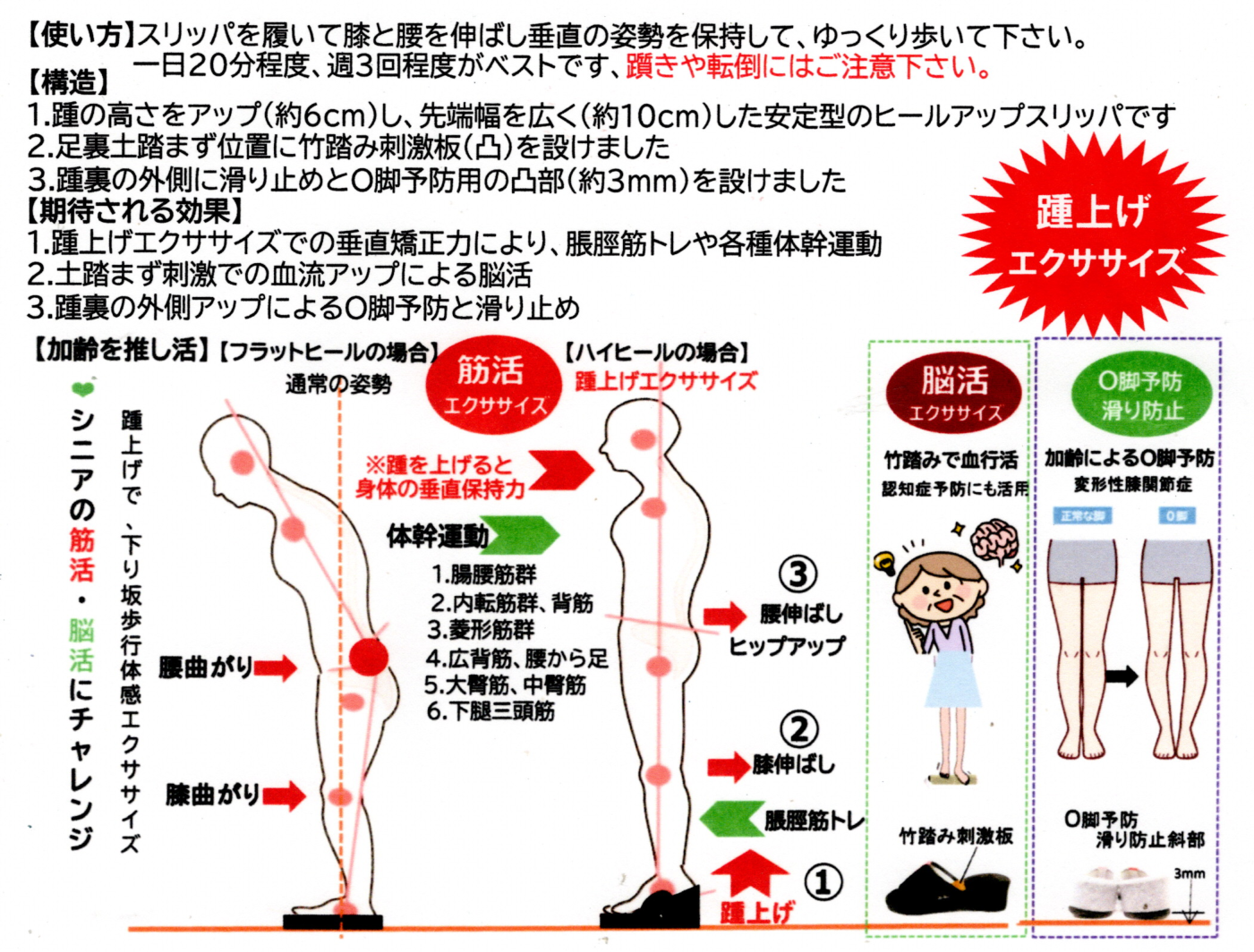 後期高齢者の開発者はフレイル予防等のために日々ウォーキングに励んでおります、上り坂は腰を曲げて前屈み歩行となり大変ですが、下り坂になると姿勢が垂直に矯正され腰が伸び膝も伸び脹脛が張って鍛えられていることを実感しました、そこで平坦部でも下り坂の姿勢を保持出来れば必然的に腰や膝や脹脛等が刺激矯正されエクササイズに有効であると確信し、シニア向けとして敢えて踵を高くし前部幅を広くし、且つ脳活やO脚予防効果を期した機構のヒールアップスリッパを試作して実験を繰り返し開発に挑みました。