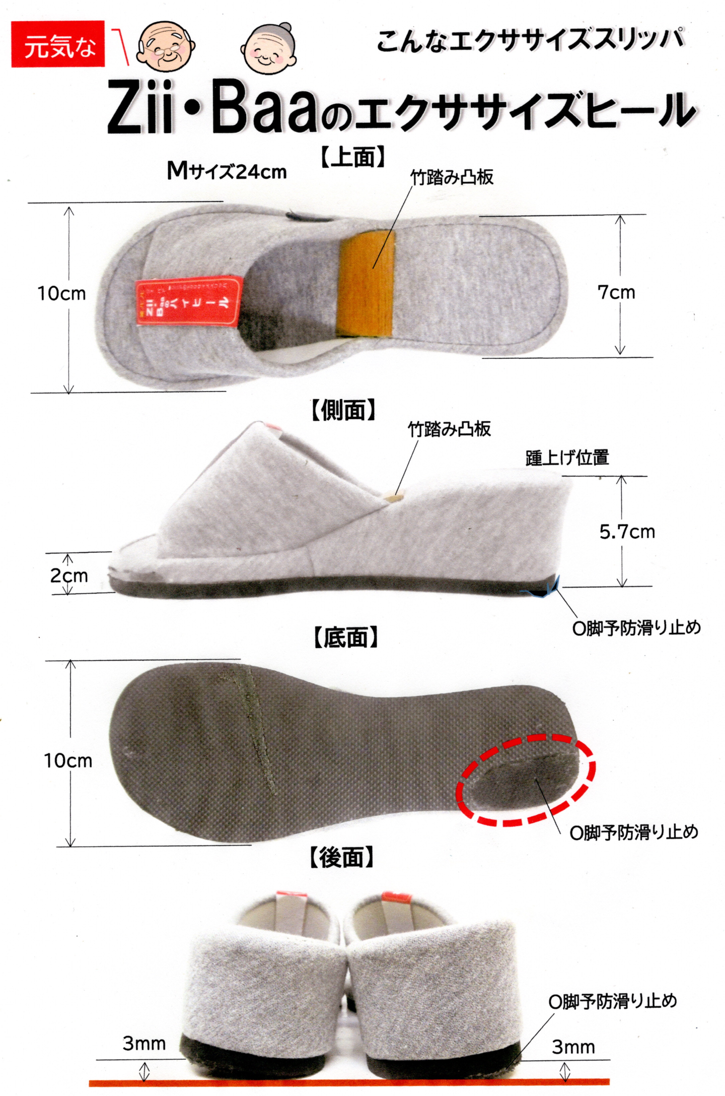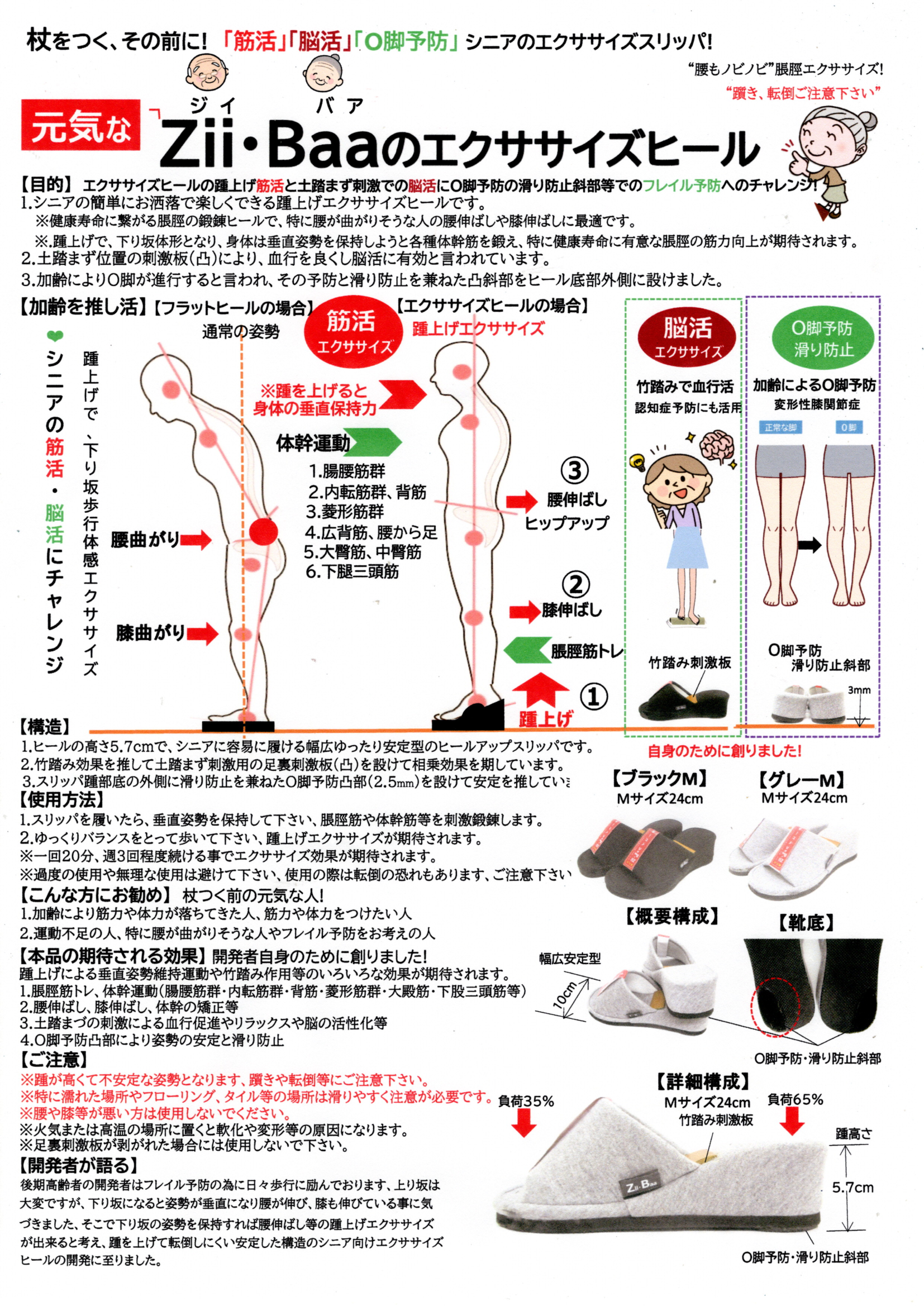 ヒールの高さは5.7cmで先端は丸みのある幅広安定型で足の土踏まず位置に竹踏み効果を期して足裏刺激凸部を設け、踵底外側にO脚予防と滑り防止を兼ねた斜凸部を設けた基本構造で、シニアの脹脛エクササイズ等や脳活やO脚予防を目的とした構成です。