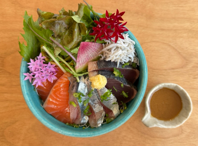 ブロッコリーベビースプラウトを敷き詰め、里山に見立てたサラダの山と、秋の田畑の実りをイメージしてカツオ・シラス・北海道産さんま・サーモンを盛りつけました。オリジナルの味噌ドレッシングをかけてお召し上がりください。