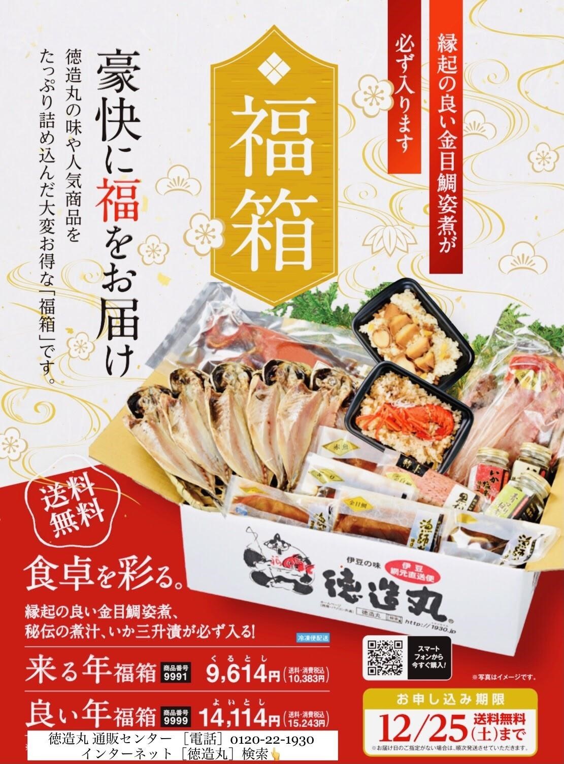 伊豆・相模エリアにて食品販売・外食チェーンを展開する株式会社徳造丸(以下 当社)(本社:静岡県東伊豆町、代表取締役:鈴木 基史・URL: http://1930.co.jp/ )は、昨年数量限定200セットを完売した「おせち二段重」を、本年は「本場の網元料理でおうち正月」をテーマに販売を開始いたしました。