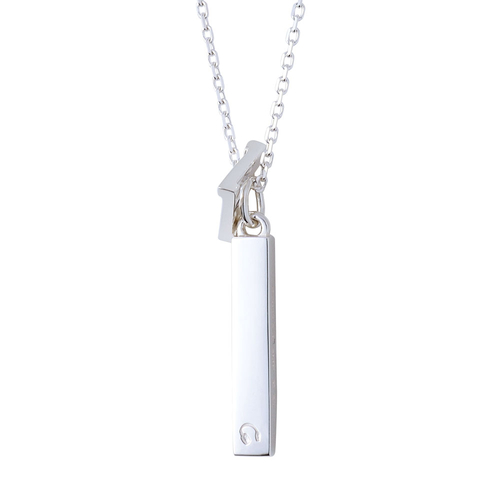 シンプルなバータイプのトップにイメージカラーストーンをセット。裏面にはヘッドフォンアイコンを刻印しました。作品をイメージした三角形チャームがポイントです。