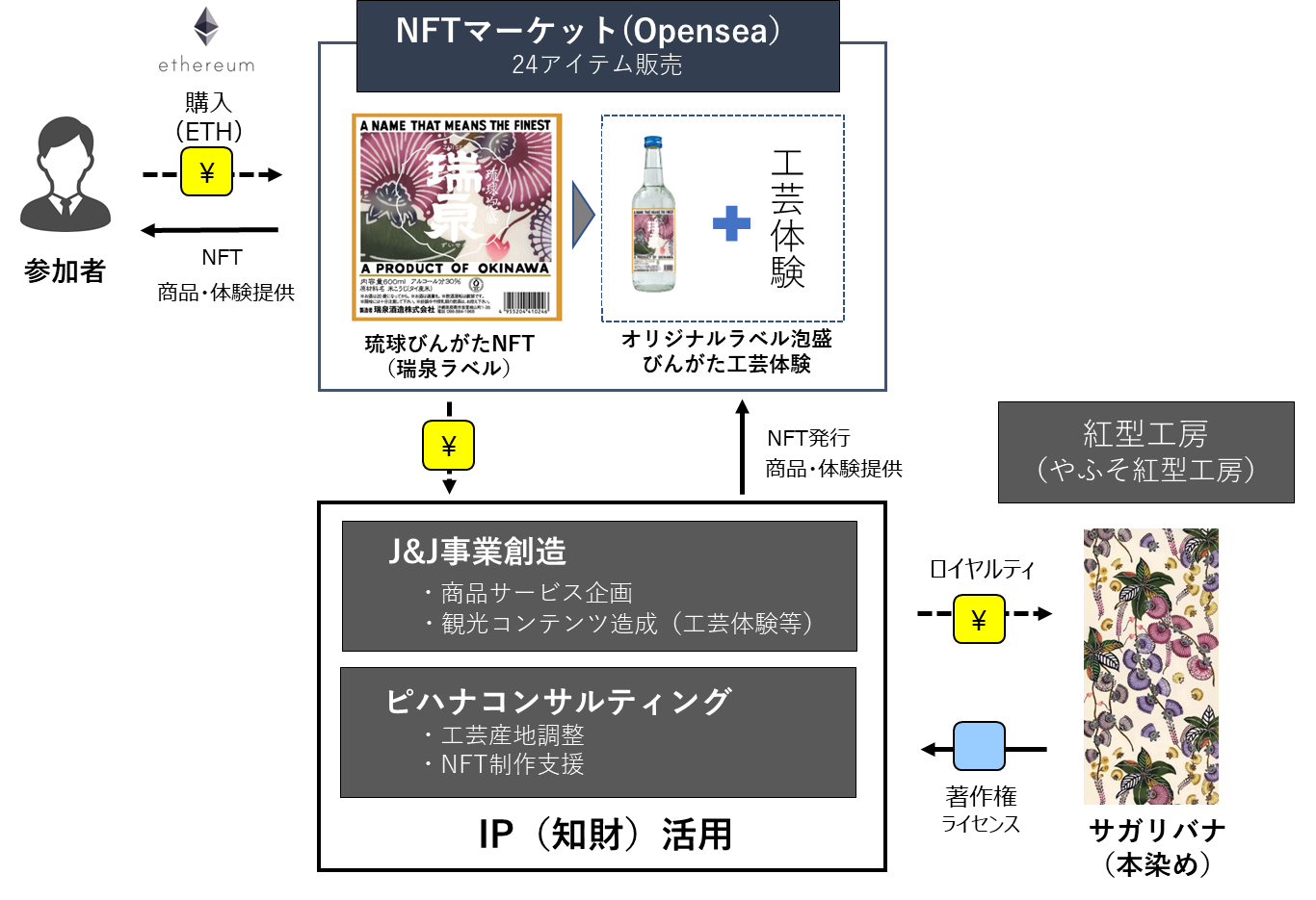 この取り組みの第1弾として、琉球びんがたラベルの泡盛購入権付NFTを2022年7月上旬に那覇市内で開催されたIVS(国内外のスタートアップ経営者・上場企業経営者が集う国内最大級のカンファレンス)にて展示・販売しました。琉球びんがたの知的財産(IP)は、連携するやふそ紅型工房及び一般社団法人琉球びんがた普及伝承コンソーシアムが提供し、IPの管理とNFTの発行をJ&J事業創造とピハナコンサルティングの両社で行いました。また、NFT購入者には、琉球びんがた工房訪問の権利もあわせて付与し、デジタル資産の枠を超えた価値を持たせ、地域における来訪者と産地の交流機会の創出も狙いました。