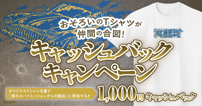 ※SCRAP GOODS SHOP(通販)、リアル脱出ゲーム店舗にて、『夜のスパイミッションからの脱出』オリジナルTシャツを事前購入された方へキャッシュバッククーポンを配布いたします。