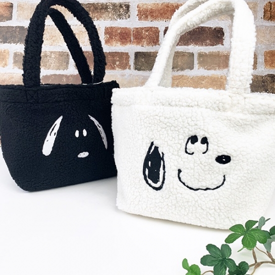 スヌーピーのお顔のデザインがとっても可愛くて何といってももこもこのボアがオシャレ♪お弁当箱や水筒がすっぽり入るのでランチバッグとしてもお使いいただけますし、ちょうどいいサイズのバッグなのでお出かけやお買い物の時にとても便利です◎肌触りもよく洋服も合わせやすいので、プレゼントにもピッタリです♪