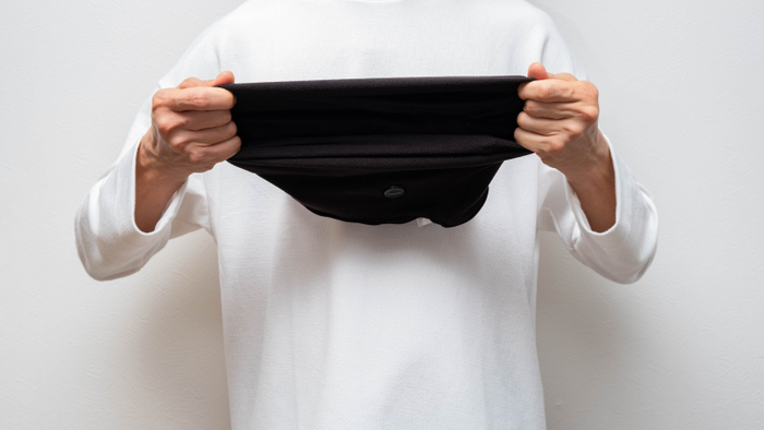 かさばらず、熱を逃さない被って着用するタイプを採用。生地には伸縮性があるため着脱がしやすいです。また、表地はフリース素材、裏地はマイクロフリース素材で、さらに柔らかく気持ちのいい肌触りを実現しました。