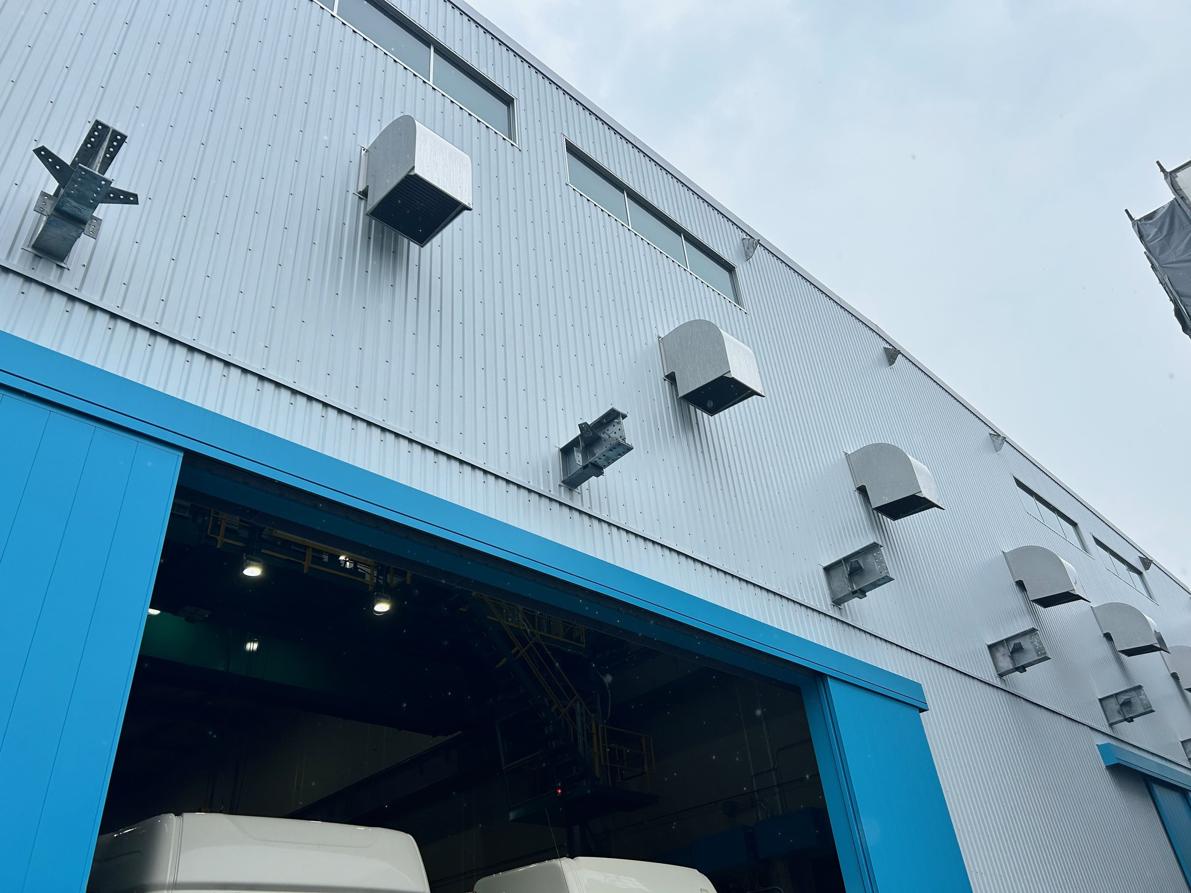 新倉庫は、旧倉庫に引き続き「鋼材」の取り扱いを主として行います。サビ抑制のため換気機能を向上させ、換気用のダクトの増設や東西に大型の開口部を設けるなど、鋼材の品質を維持する機能を向上させました。また重量物の輸送に対応する無人搬送車(AGV)を導入したほか、自動操縦機能を追加可能な天井クレーン2基を設置するなど、今後のより高度な省人化を見据えた設備更新を行なっています。安全面では建屋の配置変更に伴い、大型トレーラーの転回スペースを拡大するなど、経験の浅いドライバーでも搬入出しやすくなり、より安心してご利用いただける倉庫となりました。