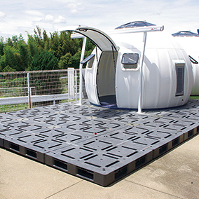 床面を水平にできるアジャストボルトを装着。設置場所に傾斜・勾配がある場合に、接地面を水平にする役目と、大雨時の浸水を防ぐ(水位14cmまで)かさ上げの目的で使用します。また雨水が床パネル(60mm厚)を超える場合では必須アイテムです。
