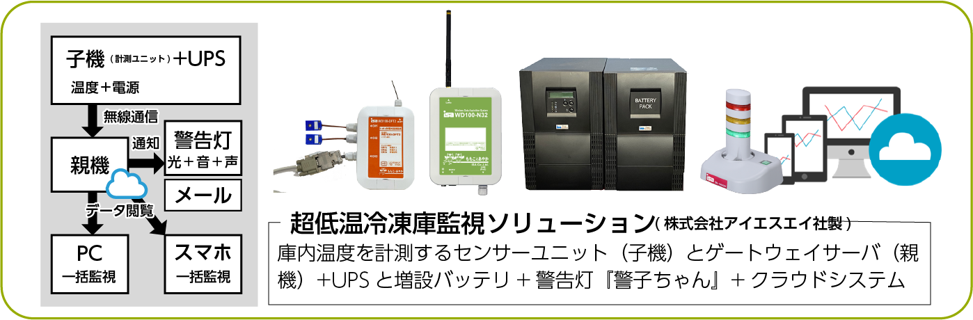 「超低温冷凍庫監視ソリューション」は、コロナワクチンを保管する冷蔵庫、冷凍庫、超低温冷凍庫(ディープフリーザー等)における温度異常や電源異常の監視を行い、停電、機器の故障や不具合、人為的トラブルなどによるワクチン廃棄事故の未然防止に寄与するシステムです。LoRa無線データ計測システム「WD100(製品名:ももことあやか)シリーズ」を応用し、自動監視と自動通報、そして自動で非常用電源へ切替を行う徹底した自動化システムで、管理者の負担を減らし、安全で確実な対応が可能になります。