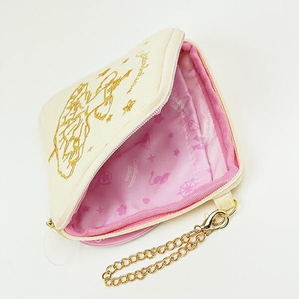 近くで見た質感はこんな感じのようですね。さくらちゃんのコスチューム部分は、細かな刺繍で丁寧に表現されていて、繊細さと高級感がしっかり伝わってきます。ファンにはたまらないディテールへのこだわりが光る、特別感のあるポーチです。