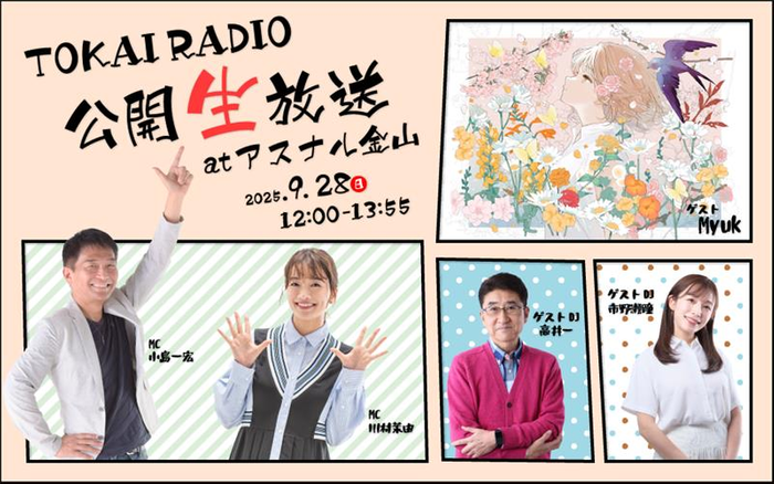 TOKAI RADIOは9月28日(日)に、アスナル金山で「TOKAI RADIO 公開生放送 atアスナル金山」を実施する。12時00分から13時55分の生放送で、MCを、小島一宏(<a href="https://www.tokairadio.co.jp/camp/">「C.A.M.P. BASKET</a>」DJ )と川村茉由(<a href="https://www.tokairadio.co.jp/program/sunday/">「SUNDAY FUNDAY!</a>」DJ )が務める。ゲストにシンガーのMyukが登場し、ミニライブも行う。観覧は無料。