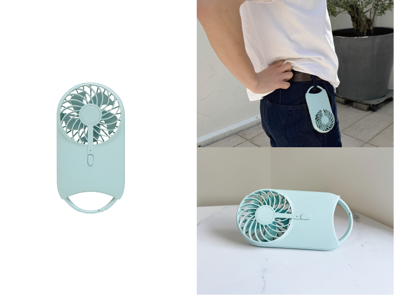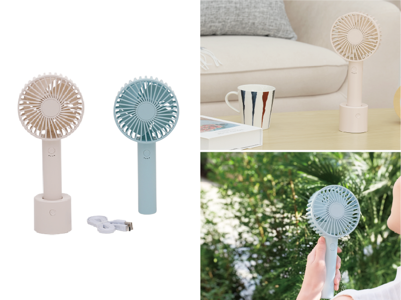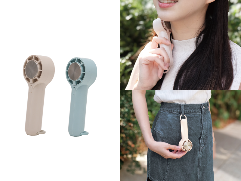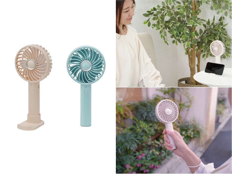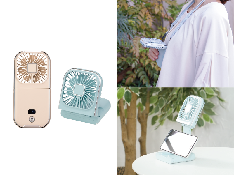 今年は持ち歩きやすいカラビナ付きタイプ、卓上で使いやすいスタンド付きや回転台付き、スマホや日傘を持ったまま使えるハンズフリータイプなどのハンディファンを、ナチュラルなアイボリーとさわやかなミントカラーで発売します。