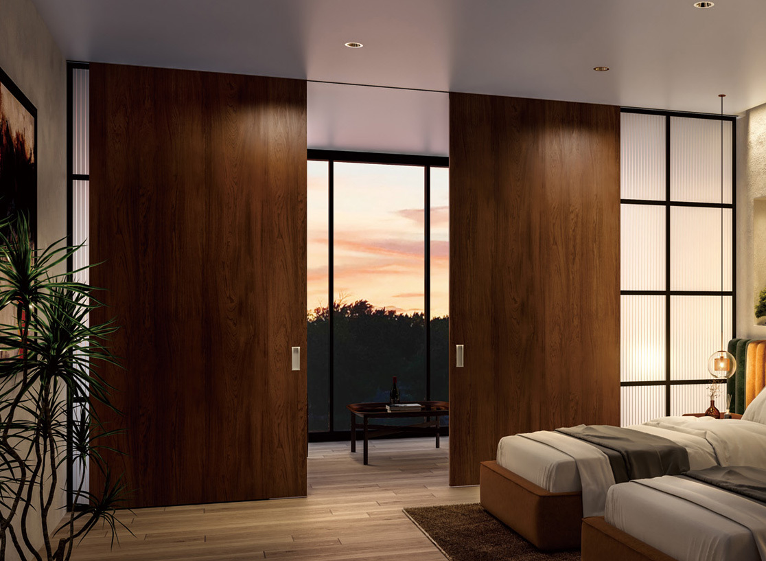 垂直収納扉金物とは、開いた扉をキャビネットへ収納し、扉手前の空間を有効活用できる金物です。プッシュオープン仕様では、扉を押すだけで開閉できる機構を搭載し、ハンドルレスデザインを実現。空間の意匠性向上と操作性を両立し、設計の自由度を広げます。