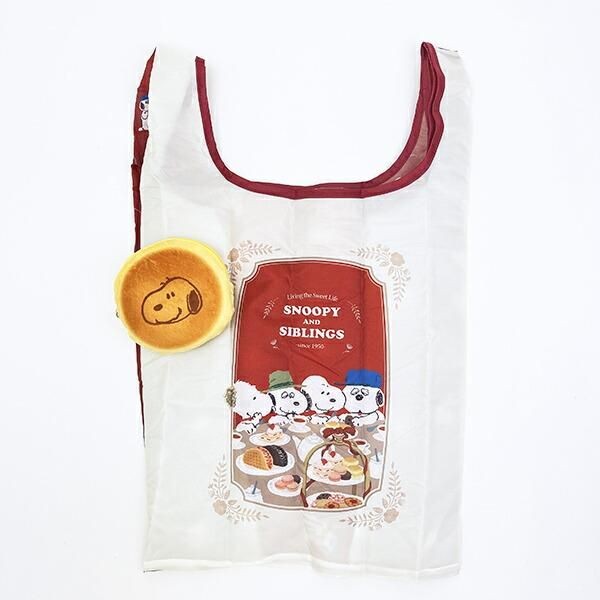 この可愛すぎる姿は、エコバッグを収納した状態。まるでカスタードケーキのような、ころんとしたフォルムがたまらなくキュート。リアルな焼き色と、スヌーピーの焼き印まで入ったデザインで、思わず食べたくなるような可愛さです。