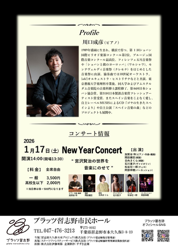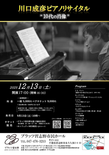 『川口成彦ピアノリサイタル “10代の肖像”』が2025年12月13日 (土)に習志野市民ホール(プラッツ習志野)(千葉県 習志野市 本大久保 3丁目8−19)にて開催されます。