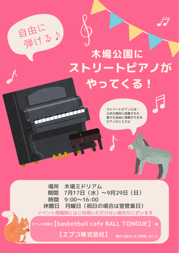 木場公園では、園内の施設「木場ミドリアム」内にストリートピアノを設置しました。9月29日(日)までの期間限定で、誰でも自由に演奏をお楽しみいただけます。