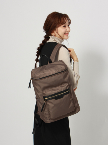 今回のリュックは、カジュアルな服装だけでなくビジネスシーンにも相性が良い、上品な光沢感が特徴のツイル生地を採用。シンプルなデザインながら、各所にアクセントとしてゴールドやレザー調の素材を使用しています。容量のある内側のメイン収納には、ボトルホルダーや内ポケット、13.3インチまでのノートPCを収納できる専用ポケットを設置。外側には正面・背面・側面に加え、底面にもポケットを設置し収納力を高めています。また、収納力は高めながらも大きすぎない適度なサイズ感や、メイン収納に外から直接出し入れができるサイドファスナーを取り入れるなど使い勝手にもこだわった仕様となっています。
