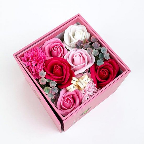 フタをあけると、中にはピンクを基調とした綺麗なお花が現れるんです!お花に顔を近づけると、ふんわり優しいソープの香りがします。
