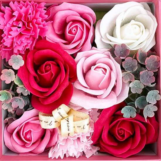 こんなギフトボックスもらえると嬉しいですよね♪もちろん自分用に購入して玄関やリビングのスペースに飾ってもOK!お花はソープの香りがするのでベッドサイドに置いて癒しアイテムとしても使えそうですね。