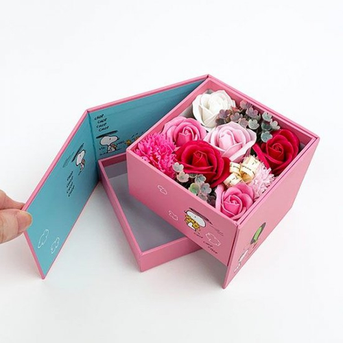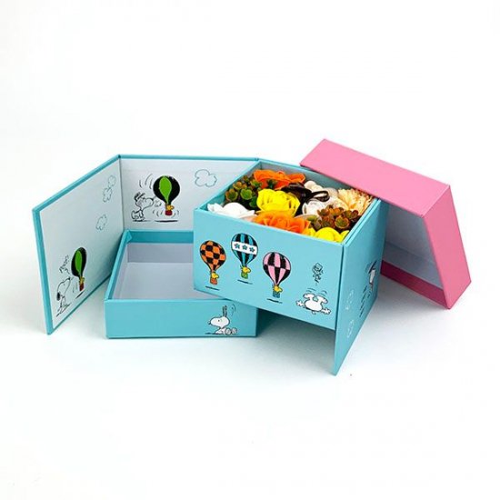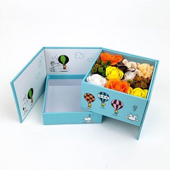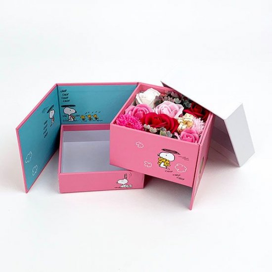 [スヌーピーギフト]お花からソープの香りがふわっと広がって、物語が始まります。スヌーピーの絵本のようなギフトボックス♪大事な人にずっと飾ってもらいたいです。