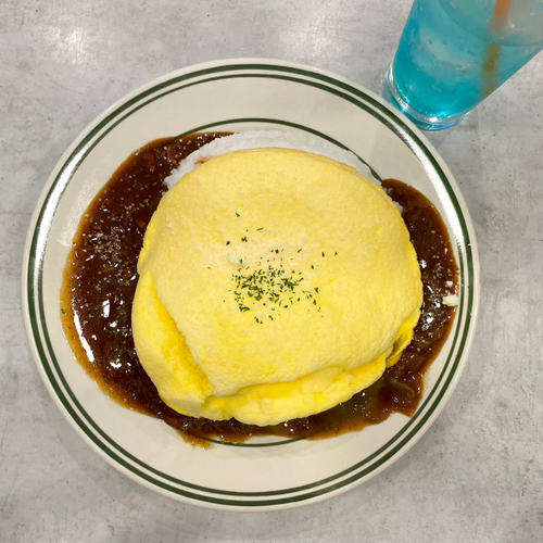 作りたてのぷるぷるメレンゲオムレツと牛豚あいびきの贅沢デミグラスシチューのハーモニーをお楽しみください。