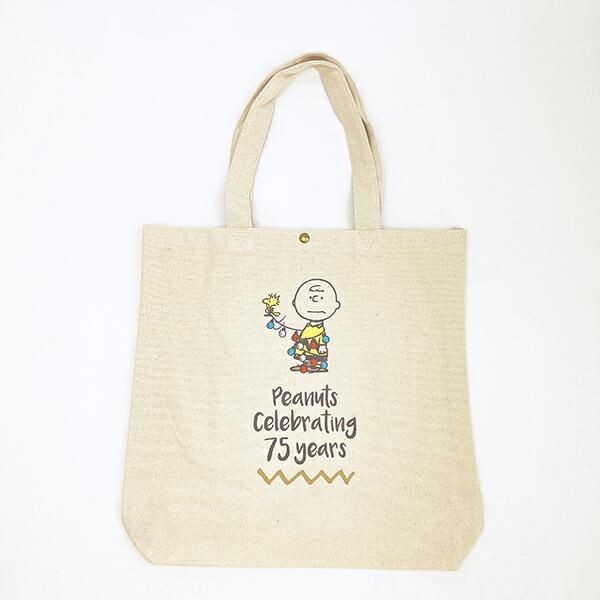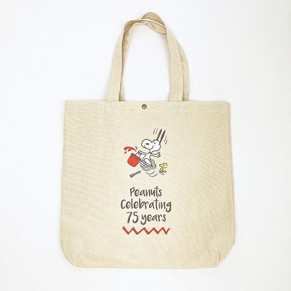こちらは、スヌーピー75thをお祝いするデザインがシンプルながらもおしゃれなトートバッグです。