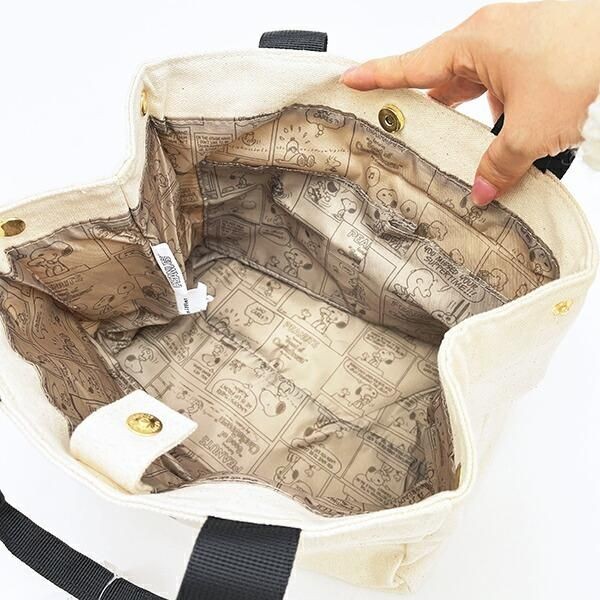 内側の生地はスヌーピーのコミックが描かれており、遊び心に溢れています。持っているだけで楽しい気分になりますよ。