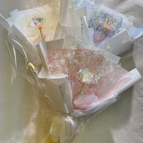 これからの季節にピッタリの花束のルームライト、ホログラム素材で作られたバラにカスミソウ(ブリザーブド)で華やかさを演出。