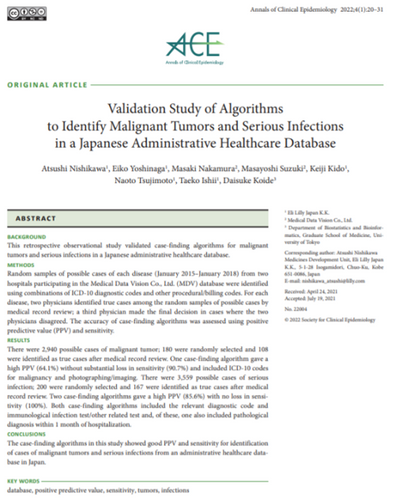 メディカル・データ・ビジョン株式会社(東京都千代田区、代表取締役社長:岩崎博之)の保有する国内最大規模の診療データベースにデータを提供している医療機関において、アウトカムバリデーション(疾患を特定するアルゴリズムの正確性を検討・検証)研究論文が、2022年1月7日付で日本臨床疫学会の発行する学会誌「Annals of Clinical Epidemiology」に掲載されましたのでお知らせします。