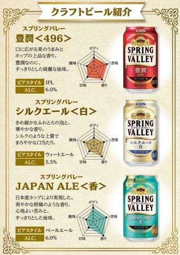 「ビア電」初!クラフトビール「スプリングバレー(3種類)」を飲み比べ! さらに、キリン新ビール「晴れ風」や「一番搾り生ビール」、 滋賀の食材が入ったオードブル料理が楽しめる!