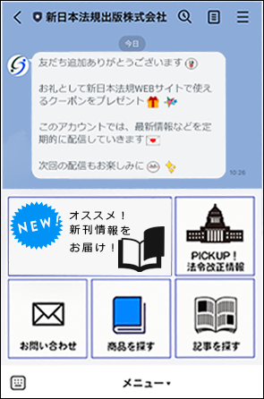 LINE公式アカウントに初めて友だち追加いただいた方限定で配信する500円クーポンは新日本法規WEBサイトでの商品ご購入時にご利用いただけます。