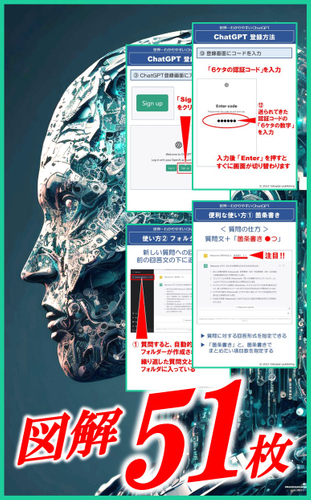 「世界一わかりやすい CgatGPT~本質がよくわかる入門書~」では、その登録方法と操作方法を図解を多数使用しわかりやすくお伝えします。その図解の枚数、実に50枚以上! 「ChatGPT」を取り上げた電子書籍の中でも「はじめ方が一番わかりやすい電子書籍」を目指して構成しています。