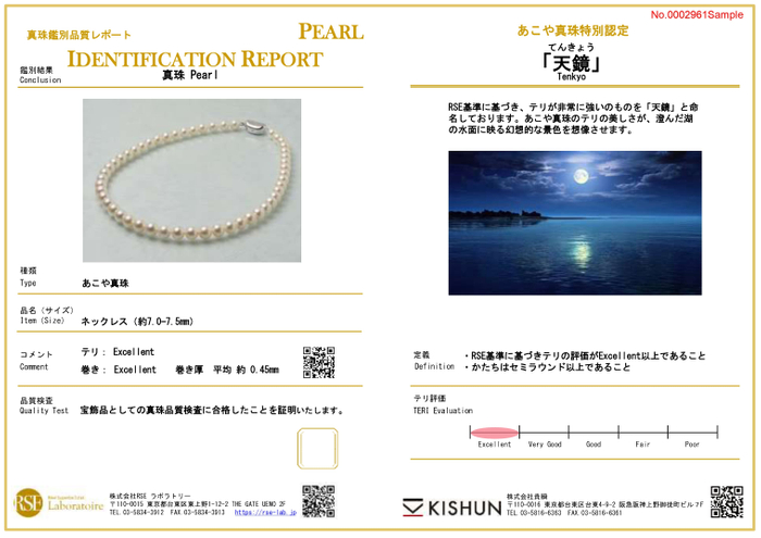 当社では真珠の鑑別機関であるRSEラボラトリー共同の元、形・巻き・キズ・色・サイズ・連相の品質検査項目で宝飾品としての真珠品質検査に合格し、宝石の条件にある「美しさ・耐久性」に該当する、真珠の「テリ・巻き」がExcellent以上の真珠に『貴珠千宝』『天鏡』『十二単』というオリジナル呼称をつけました。