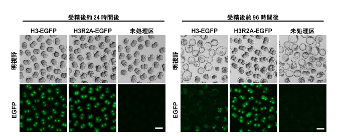 PRMT5及びPRMT7が付加するヒストン修飾の中で胚発生に重要な修飾を調べるため、これらのヒストン修飾が付加されないようにアルギニンをアラニンに置換した変異体(H2AR3A、H3R2A、H3R8A、H4R3A)を受精卵の前核に取り込ませた結果、H3R2Aを核内に取り込ませた受精卵だけが2細胞期で停止することが明らかになりました(図1)。