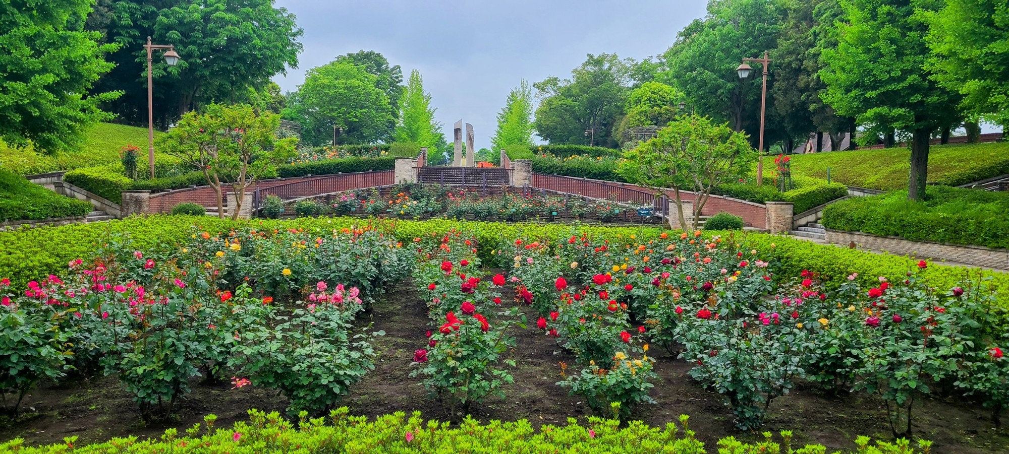 秋留台公園の見どころの一つであるバラ園は、レンガと大理石を使用した造りで、モダンローズを主体に約110種450株もの色とりどりのバラをご覧いただけます。