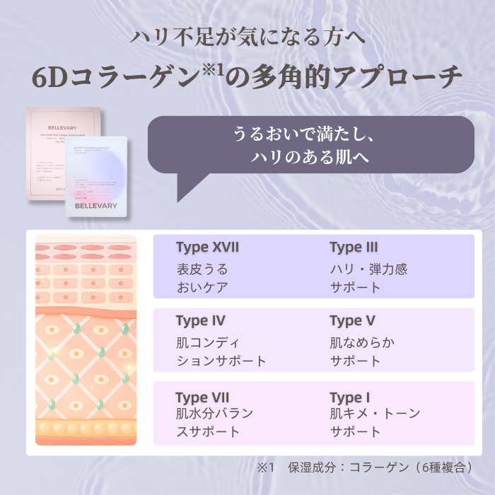 6Dコラーゲン、PDRN、二源ハニー(マヌカ&Jelly bushハニー)を配合した集中ケア用シートマスクです。乾燥、くすみ、年齢に応じた肌悩みが気になる肌に、うるおいとハリ感を与える設計です。シート素材には旭化成ベンリーゼ®アイスフェザーを採用し、優れた吸液性・保液性、軽薄・通気・高密着、生分解性・低刺激といった特長を備えています。<コラーゲン分解酵素抑制率57.6%>