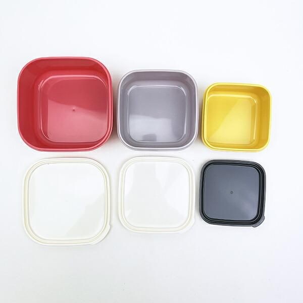 こちらも赤、グレー、イエローとファッションセンスを感じるバランスのとれた配色が素敵です。おかずとご飯を分けて詰められる小分けのお弁当箱です。余ったおかずをまとめる小分けのタッパーとしてもお勧めです。フタを外して電子レンジ使用可能。※食洗機 使用不可!※【サイズ】(S)H90×W90×D44mm(220ml)、(M)H105×W105×D51mm(360ml)、(L)H120×W120×D58mm(550ml)サイズ:0cm×0cm×0cm 材:PP、PE