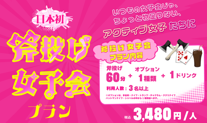 「斧投げ女子会プラン」とは、いつもの女子会ではちょっと物足りない、新しい刺激を求めてるアクティブ女子に向け、AXE THROWING(斧投げ)60分コースに加えて、オプション1個と1ドリンクが提供されるプランとなります。