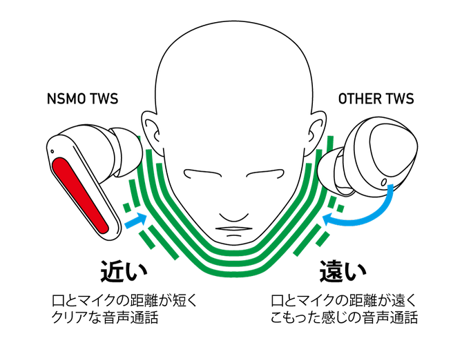NSMO TWSのマイクは、口の方向(音源)を向くように内側に設計されています。マイクは非常に低い周波数と非常に高い周波数のサウンドを排除し、スムーズでクリアな音声を実現しました。 NSMO TWSは、電話会議やテレビ会議に最適なマイク品質も提供します。これにより話し手と聞き手の両方の声がはっきりと聞こえるようになります。