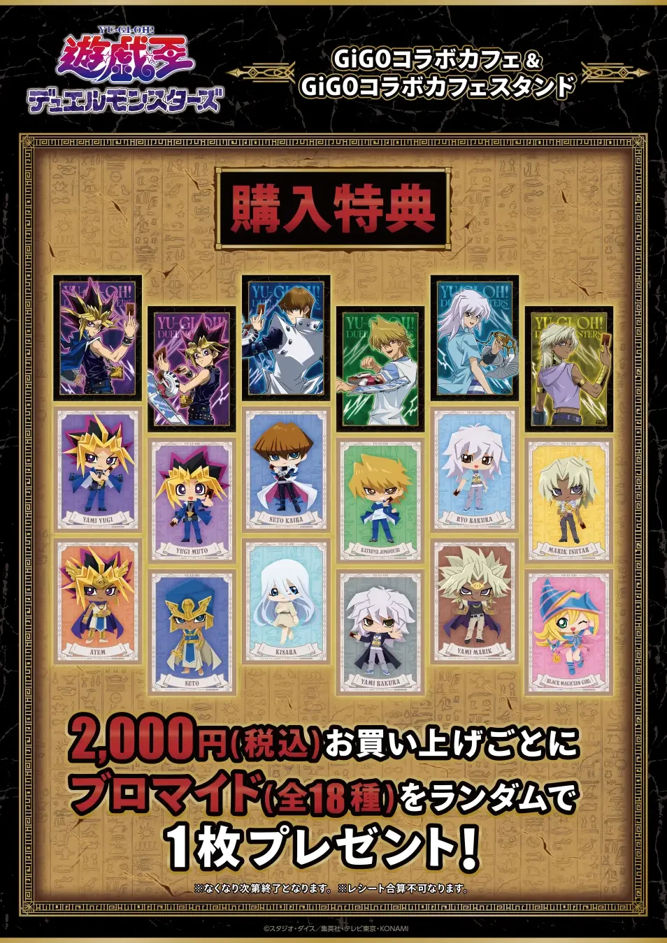 『遊☆戯☆王デュエルモンスターズ』商品を2,000円(税込)お買い上げごとに、ブロマイド(全18種・ランダム)で1枚進呈いたします。