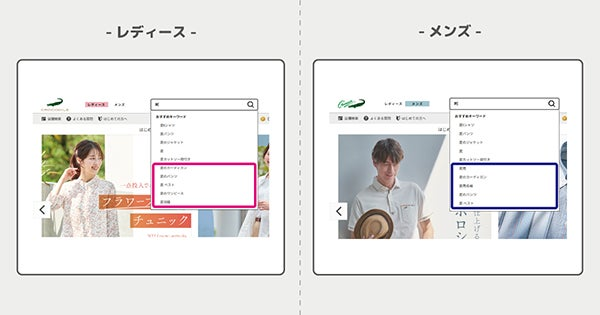 ジェンダーカテゴリー(レディース・メンズ)の選択と連動し、表示される商品やサジェストの結果が切り替わるようになりました。