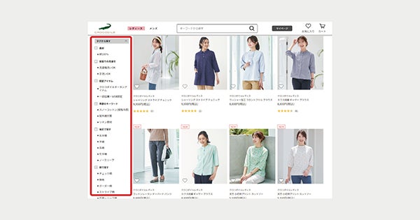 「綿100%」「洗濯機洗いOK」などの商品特性をもとにしたタグや「スノーコットン」「リネン素材」などの季節のキーワードのタグを利用した絞り込み検索でユーザーの細かなニーズに合った商品を表示することができ、UX向上に寄与します。