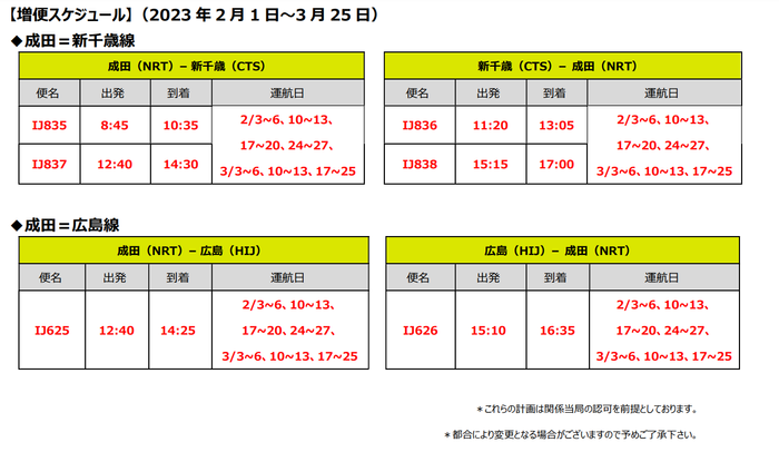 スプリング・ジャパン株式会社(本社:千葉県成田市、代表取締役社長:米澤 章、以下:スプリング・ジャパン)は2023年2月1日~3月25日の期間において、成田=新千歳線・広島線を増便し、本日17時より販売を開始いたします。今回の増便により、新千歳線は1日最大4往復、広島線は1日最大3往復となります。