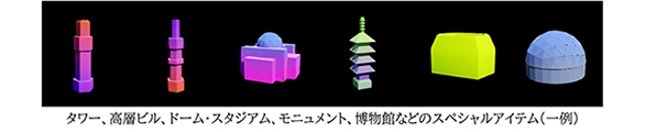 タワー、ドーム・スタジアム、モニュメントなどのスペシャルなアイテムが登場し、これらも“まち”の一部として取り込まれます。