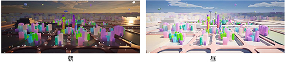 朝・昼・夕方・夜のシーン展開が行われ、さまざまな“まち”の表情を楽しむことができます。