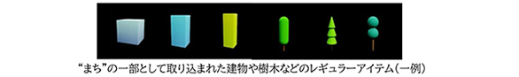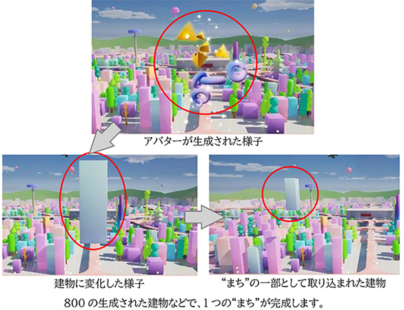 お客さまのアバターが現れ、さまざまな色や形に変化し、架空の“まち”に取り込まれます。