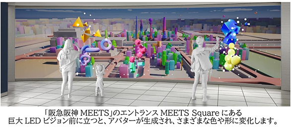 「阪急阪神 MEETS」のエントランスのMEETS Squareにある巨大 LED ビジョンの前にお客さまが立つと、LEDビジョン内にアバターが現れ、さまざまな色や形に変化し、架空の“まち”の一部として取り込まれていきます。アバターが建物や樹木となり“まち”が大きくなっていく楽しさや、スペシャルアイテムとして大きくかつシンボリックな建造物に変わる歓びを体験いただけます。これにより、お客さま自身が“まち”を彩り、未来をつくる一部であることを感じていただくことができます。