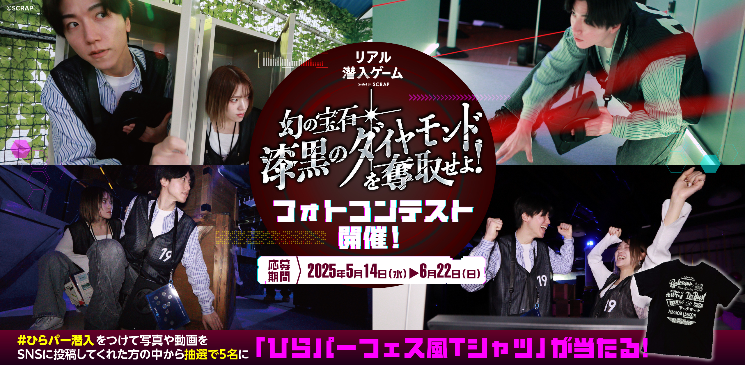 全世界で累計1,490万人以上を動員しているリアル脱出ゲームを企画制作する株式会社SCRAP(本社:東京都渋谷区、代表:加藤隆生)は、ひらかたパークで好評開催中の「リアル潜入ゲーム」最新作、『リアル潜入ゲーム 幻の宝石「漆黒のダイヤモンド」を奪取せよ!』にて、一部プレイエリアでの撮影解禁と、フォトコンテストの開催を発表いたします。