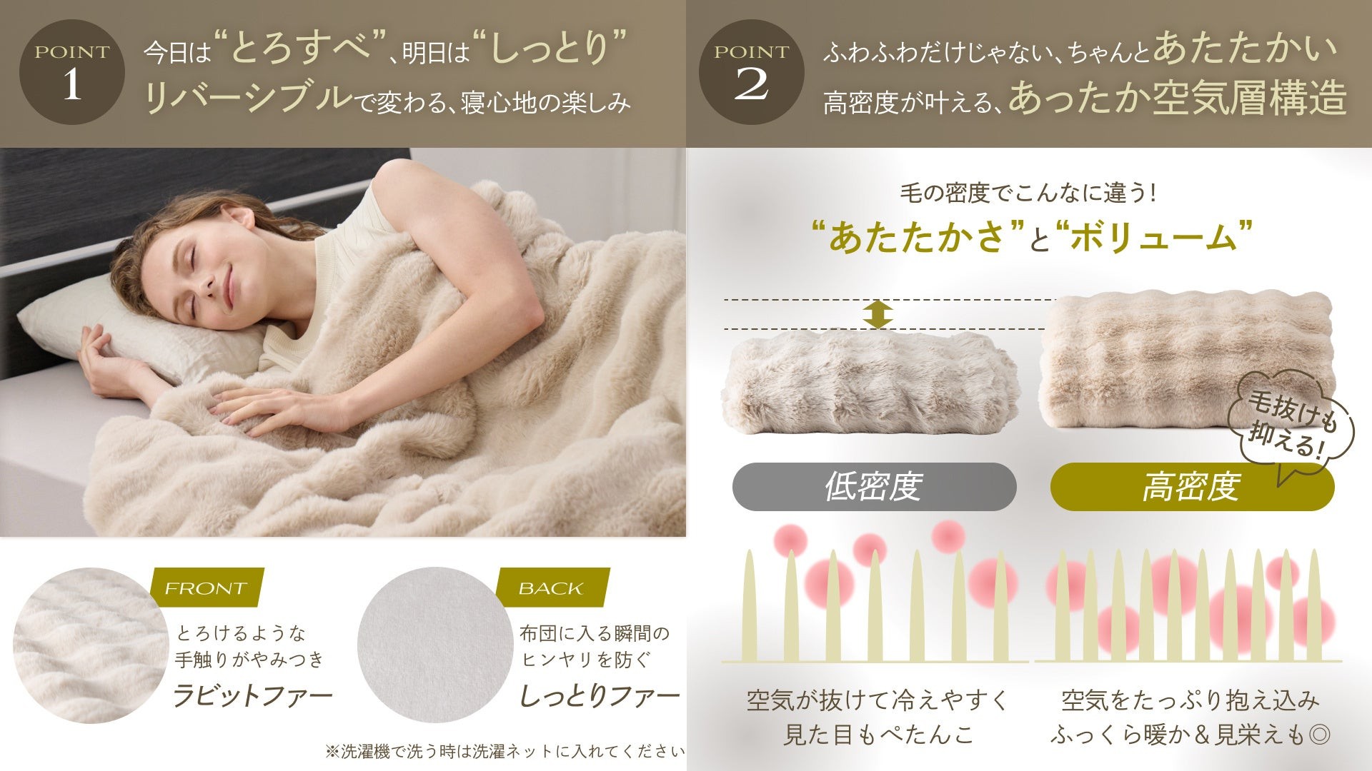 くつろぎの時間を格上げする1枚で毛布・掛け布団カバー・クッションとして使える万能ケットが登場。高密度のふわもこ生地が空気を抱え込み、極上のぬくもりを実現しました。抗菌防臭・静電気防止加工で清潔&快適、おうちで丸洗いも可能です。リバーシブル仕様で気分やシーンに合わせて使い分けでき、見た目もおしゃれ。普段使いから来客用まで、暮らしをワンランクアップさせる「とろけるご褒美ケット」です。